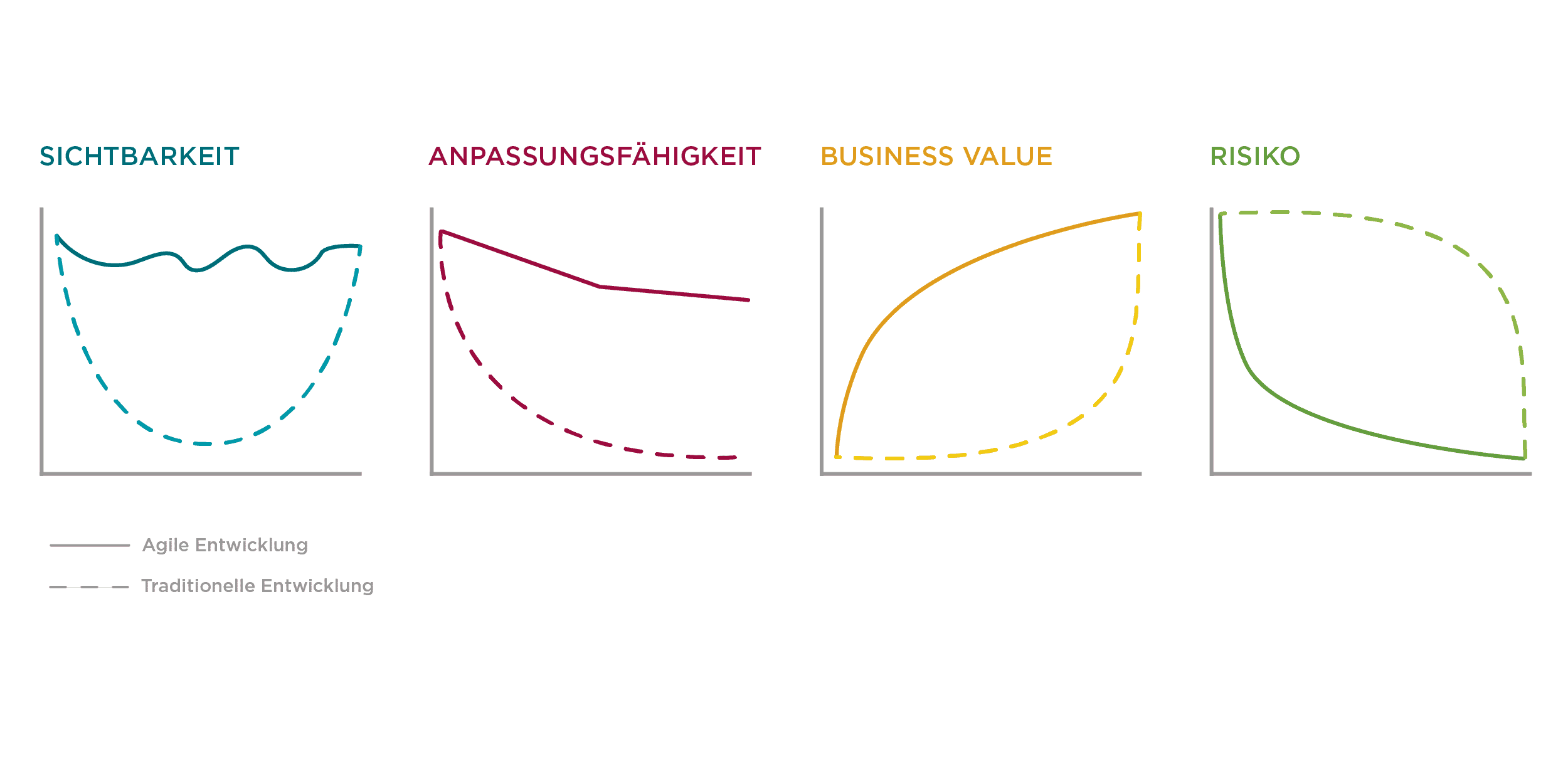 Nicht zuletzt senkt der Einsatz von Scrum damit auch das Investitionsrisiko für den Auftraggeber. Während bei der klassischen Entwicklung die Zielvorgaben von Anfang an feststehen müssen, werden sie in der agilen Entwicklung erst nach und nach geschärft. Kein Problem, denn der Arbeitsfortschritt im Projekt ist von Anfang an und permanent sichtbar. Das Risiko, an den Bedürfnissen der Nutzer und des Marktes vorbei zu programmieren, sinkt damit schon in der frühen Projektphase signifikant.