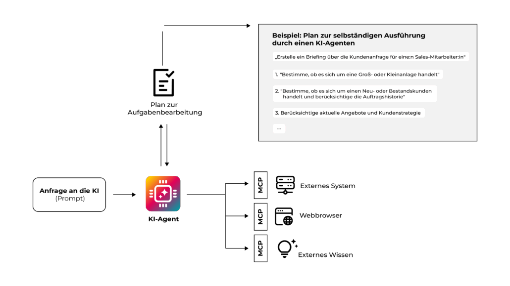 Mit den Fähigkeiten des KI-Agenten, entlang eines textlich definierten Plans mittels MCP die passenden Werkzeuge für die Erledigung seiner Aufgaben auszuwählen, ergeben sich neue Möglichkeiten: Er kann damit zum Beispiel Funktionen in externen Systemen ausführen, einen Webbrowser bedienen oder auf eine externe Wissensbasis zugreifen. So lassen sich auch komplexe Aufgaben automatisieren, die vorher aufwändig von Mitarbeitenden ausgeführt werden mussten.