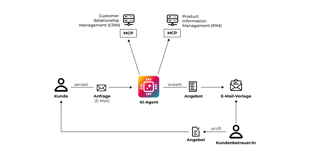 Das Angebot ist die Eintrittskarte in eine vertrauensvolle Zusammenarbeit. Die manuelle Recherche hat in der Angebotserstellung früher viel Zeit in Anspruch genommen. Mit einem passend generierten Angebotsvorschlag auf Grundlage der vorliegenden Kunden- und Produktinformationen werden Ressourcen gespart und das Angebot ist schneller beim Kunden. Möglich macht das die Anbindung von Systemen und Daten an agentenbasierte Systeme via MCP.