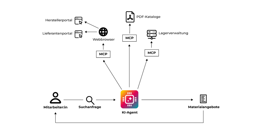 Dabei ist die manuelle Recherche auf unterschiedlichen Plattformen, Katalogen und der Abgleich mit dem eigenen Lager extrem zeitaufwändig. Mit der Anbindung via MCP und der Nutzung von Agenten lässt sich der gesamte Workflow optimal unterstützen. Auch dann, wenn eine Datenquelle von Haus aus keinen automatisierten Zugriff bereitstellt, wie es bei Lieferantenwebseiten zum Beispiel oft der Fall ist.