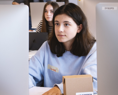 NĂ€chster Programmpunkt: KĂŒnstliche Intelligenz! Unser KI-Experte Arek Roczniewski öffnete den MĂ€dchen die TĂŒren in die Welt generativer KI. Die Aufgabe: âSchlĂŒpfe mithilfe der CodeBox in verschiedene Rollen und bringe den ChatBot dazu, dir bei der Lösung kniffliger Aufgaben zu helfen.â Auch das war toll fĂŒr die MĂ€dchen zu erleben: Wie sie die  QualitĂ€t ki-generierter Antworten durch eigenes, kluges Prompting selbst steuern können und die KI so zu einer echten Freundin und Helferin machen. Denn KĂŒnstliche Intelligenz erfordert was? Genau: menschliche Intelligenz!