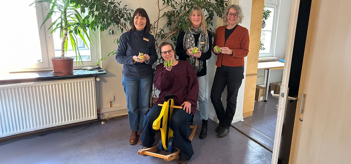 Die Tigerente ist das berühmte Maskottchen der Tagesaufenthaltstätte „Panama“ und die Botschafterin der Sozialen Hilfe e. V. Kassel. Sonst noch auf dem Bild, von links: Michaela Rohde (Soziale Hilfe e. V.), Jule Witte (Micromata GmbH), Anja Krätke (Soziale Hilfe e. V.) und Sibylle Schröder (Micromata GmbH).